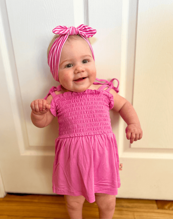 Baby girl is wearing a comfortable baby headband for little girls from By Bella Boutique.