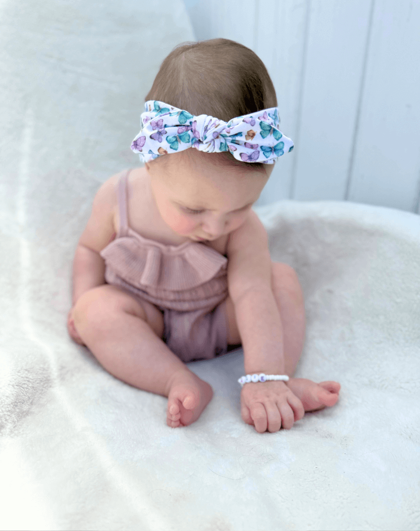Our exclusively designed butterfly print headband is easy to dress up, or keep casual. From playground to downtime, this knotted headband will make your little girl more fashionable and more beautiful. Designed with busy mamas in mind, this stretchy and pre-tied headband allows for it to be slipped on easily, hassle-free. It's also perfect at keeping any hair that your baby might have out of their face.