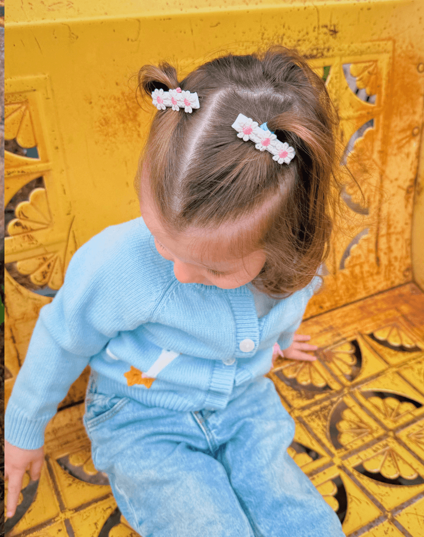 Imagine putting the final touch to your toddler's outfit with our Embroidered Pink Flower Bow Clips.