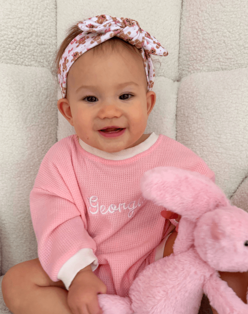 Our exclusively designed gingerbread print headband is easy to dress up, or keep casual. From playground to downtime, this knotted headband will make your little girl more fashionable and more beautiful. Designed with busy mamas in mind, this stretchy and pre-tied headband allows for it to be slipped on easily, hassle-free. It's also perfect at keeping any hair that your baby might have out of their face.