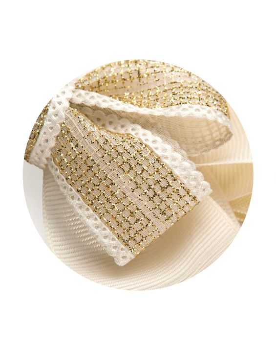 Handmade with gold ribbon, ivory grosgrain, and sequin accents