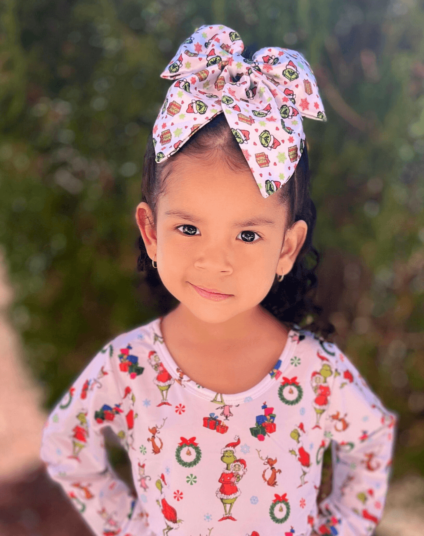 This satin fable bow is perfect for adding a glamorous look to your little girl's holiday outfit.