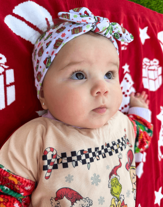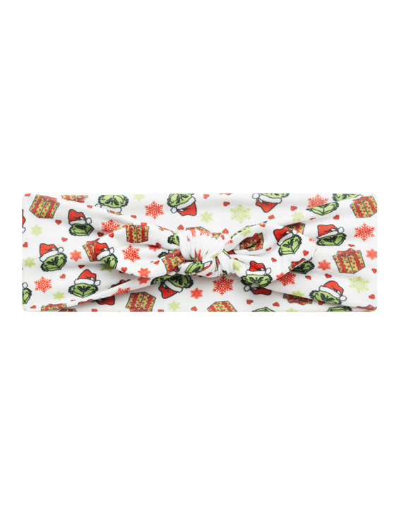 Our exclusively designed grinch print headband is easy to dress up, or keep casual. From playground to downtime, this knotted headband will make your little girl more fashionable and more beautiful. Designed with busy mamas in mind, this stretchy and pre-tied headband allows for it to be slipped on easily, hassle-free. It's also perfect at keeping any hair that your baby might have out of their face.