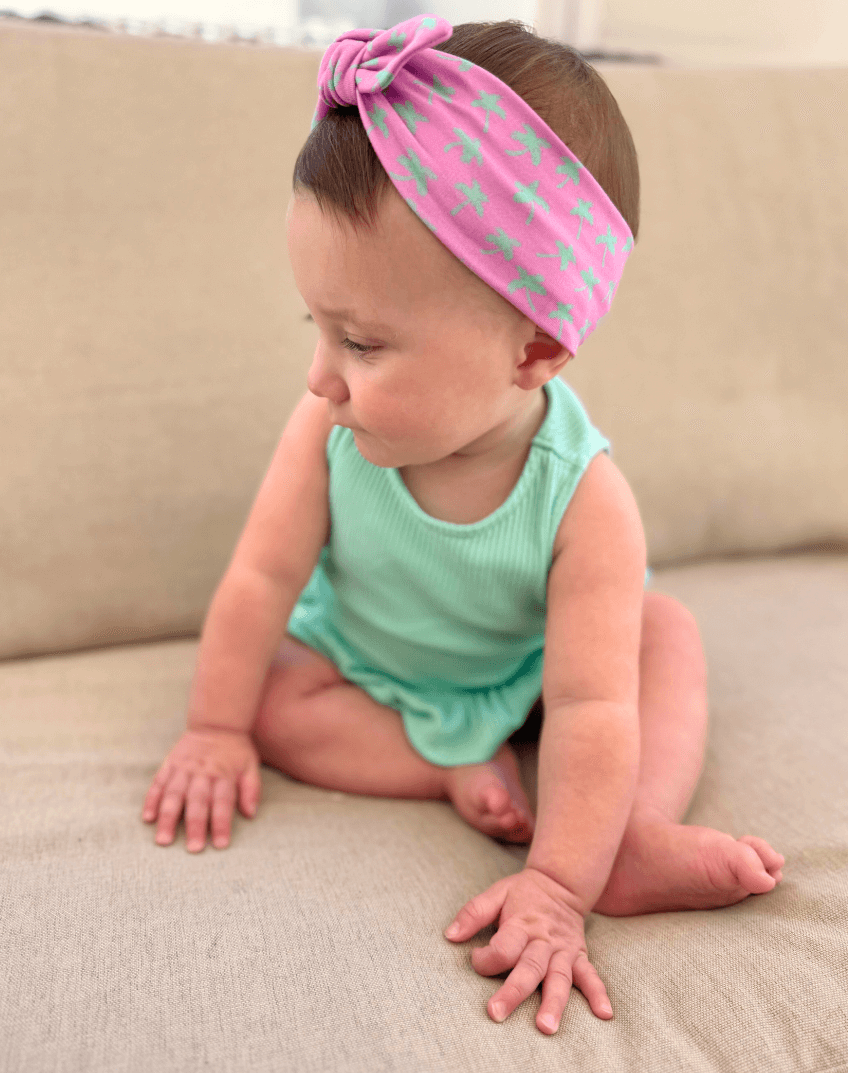 Our exclusively designed Magic City print is easy to dress up, or keep casual. From playground to downtime, this knotted headband will make your little girl more fashionable and more beautiful. Designed with busy mamas in mind, this stretchy and pre-tied headband allows for it to be slipped on easily, hassle-free. It's also perfect at keeping any hair that your baby might have out of their face.