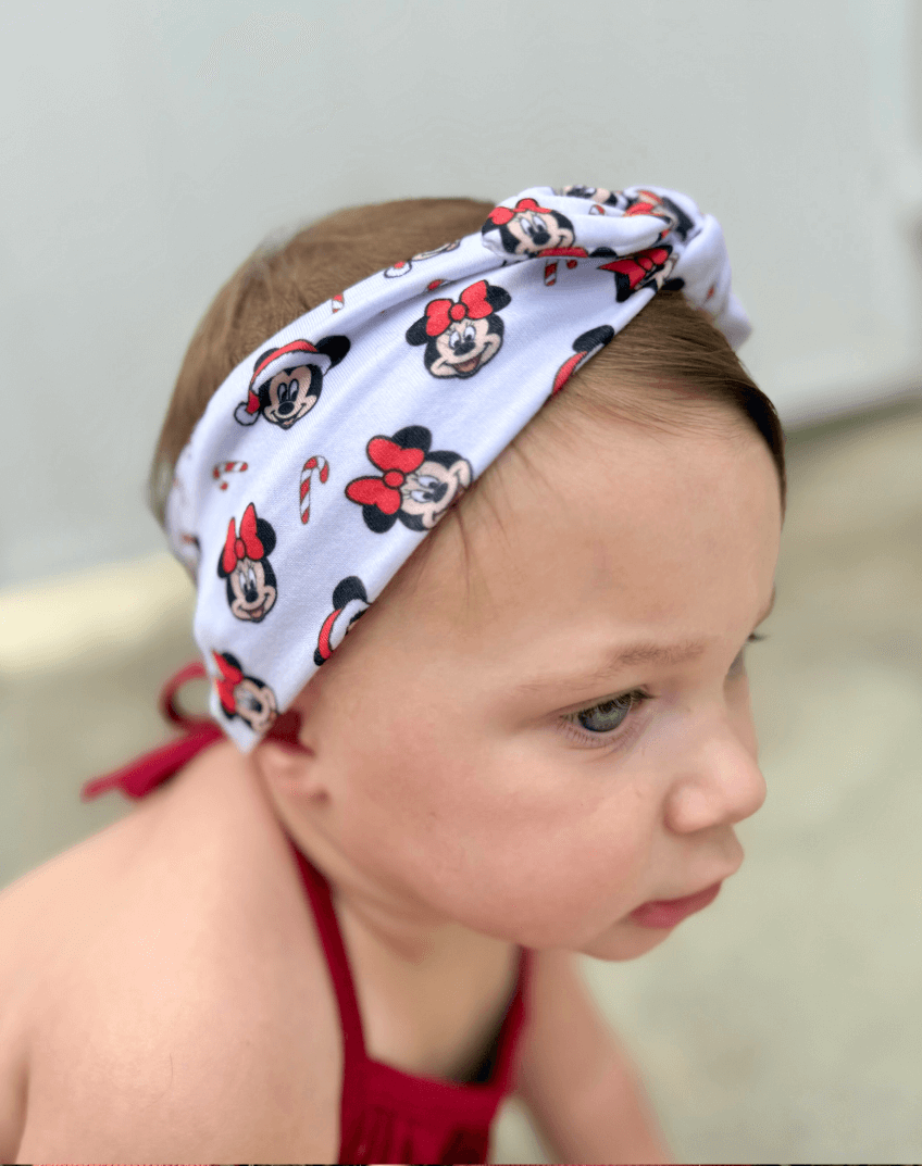 Our exclusively designed Mickey and Minnie candy cane print headband is easy to dress up, or keep casual. From playground to downtime, this knotted headband will make your little girl more fashionable and more beautiful. Designed with busy mamas in mind, this stretchy and pre-tied headband allows for it to be slipped on easily, hassle-free. It's also perfect at keeping any hair that your baby might have out of their face.