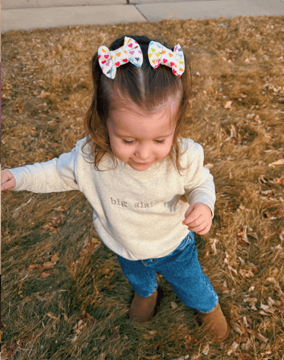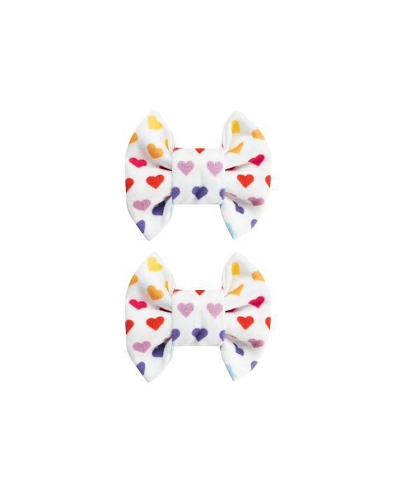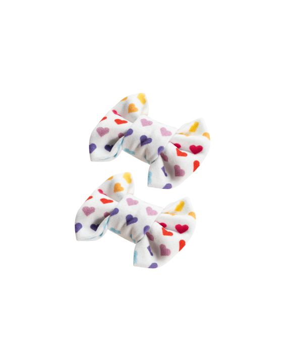 Imagine putting the final touch to your toddler's outfit with our Rainbow Hearts Print bow clips made from buttery soft stretchy fabric.